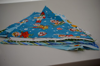 -I decided to do without the pinking shears this time around and just made straight edge triangles for my pennants... so layout one of your fabrics and cut a triangle in the shape and size you'd like...for this banner, I cut my triangle like so: